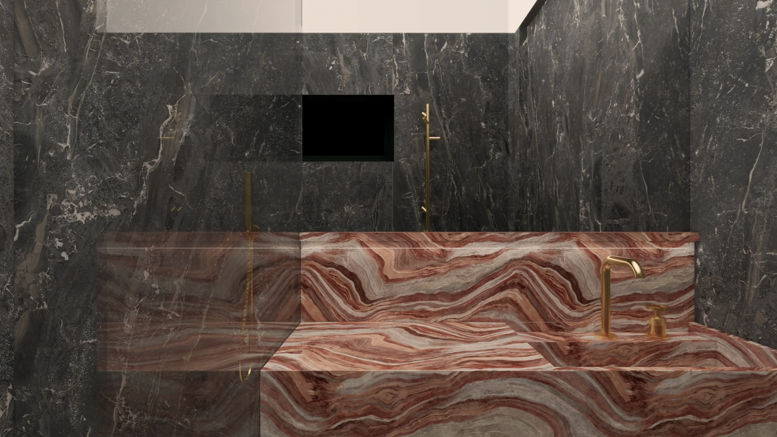 W głównej łazience panują ostre linie i wyszukane tony. Wielkoformatowe płyty z deseniem kamienia łączą się idealnie z matowym złotem na armaturze. Umywalka to forma komponentu, który łączy w sobie również blat oraz niewielką półkę pod lustrem. Razem z drewnianą szafką całość pomieszczenia to dopracowana przestrzeń, zaprojektowana z myślą o wieczornym relaksie przed snem.