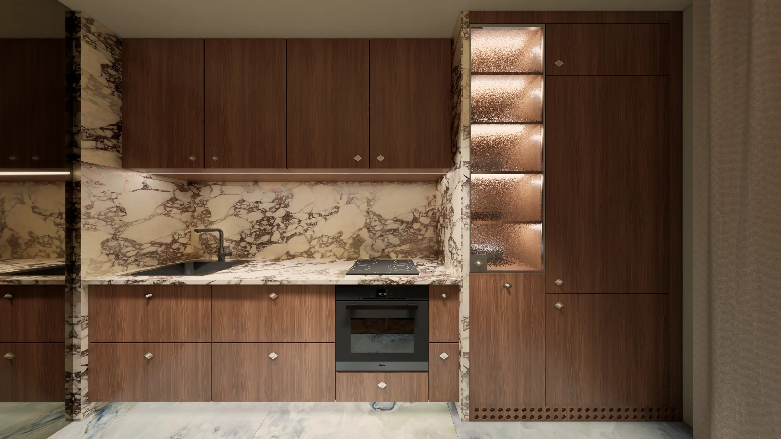 Po lewej stronie kuchni lustrzany monolit rozświetla i wprowadza dynamikę do wnętrza. Za gładką powierzchnią skrywa się jeszcze jedno pomieszczenie.