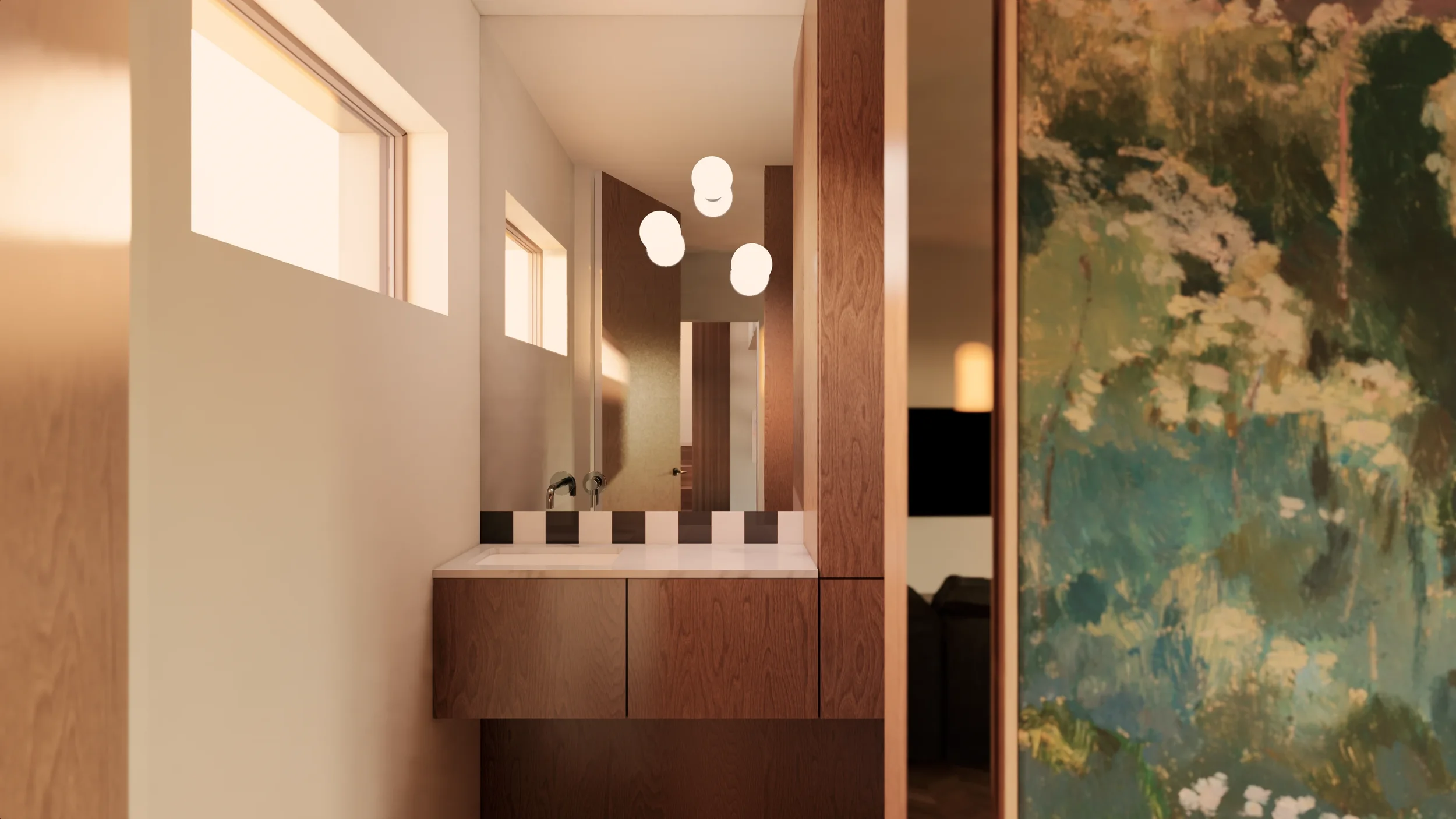 W łazience dla gości przestrzeń rozświetla ogromne lustro na wprost do drzwi, które kontynuuje dynamiczną fasadę za drzwiami. Trzy asymetryczne punkty świetlne pomagają w tym po zmroku. Prosty deseń drewna jest przełamany ceramiczną szachownicą nad blatem szafki.