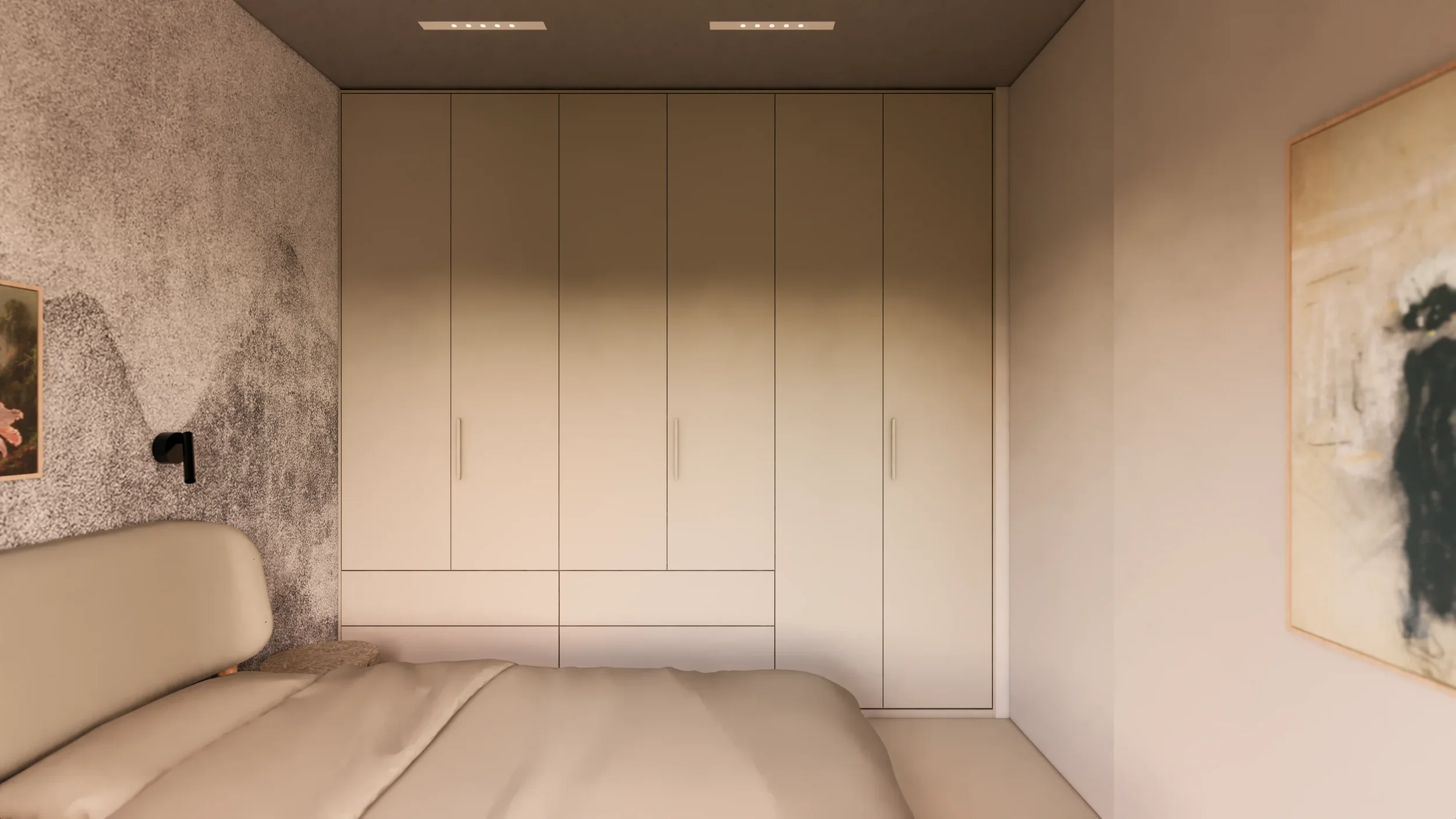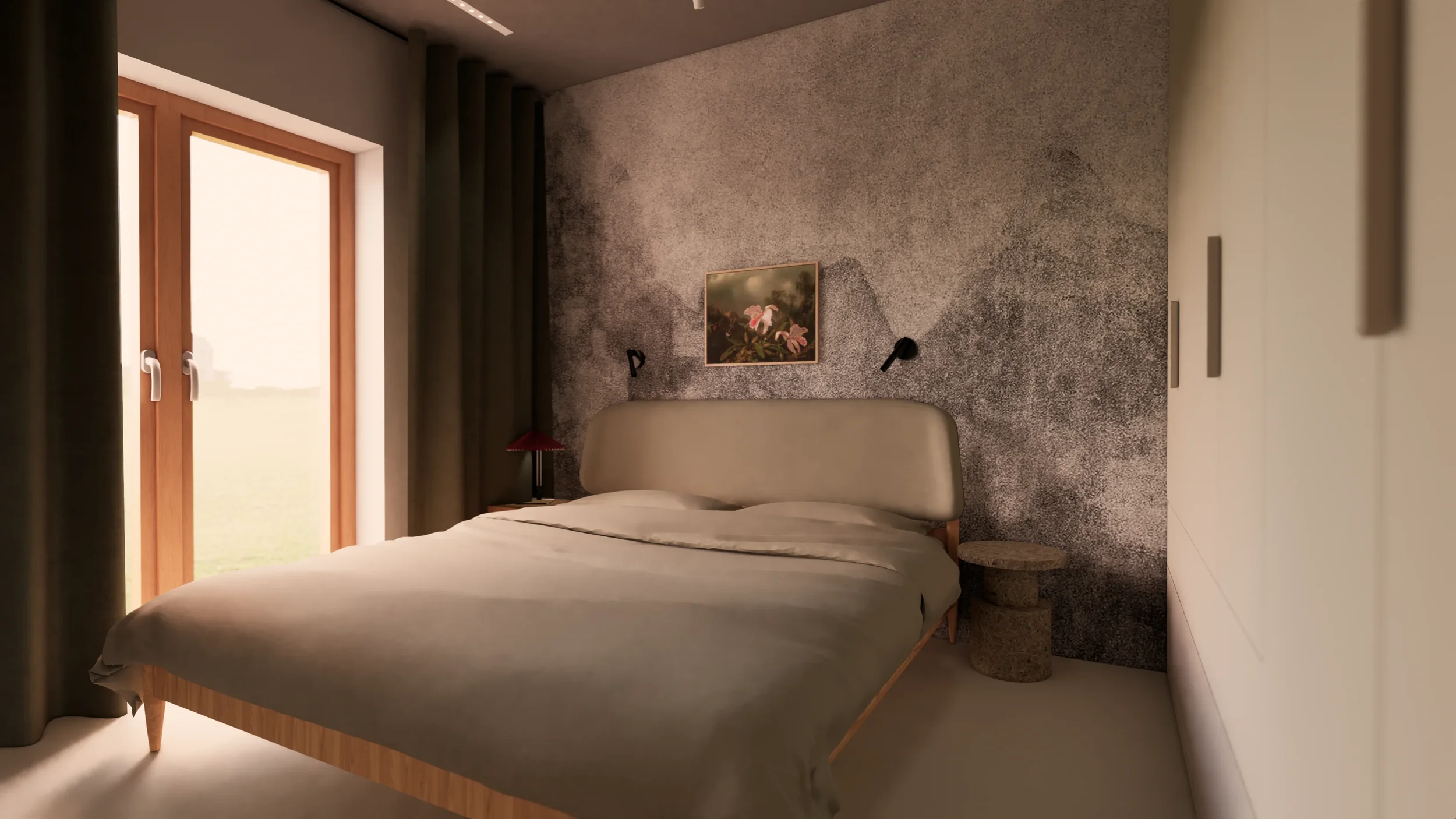 W sypialni kluczowy był spokojny sen: to z tą myślą podjęta została każda decyzja projektowa. Priorytetem w tej przestrzeni było pełnowymiarowe, szerokie łóżko- każdy inny element orbituje wokół niego. Szafka po lewej skrywa za sobą gniazdko do ładowania telefonu, a na blacie niewielką lampę do nastrojowego oświetlenia. Tapicerowane wezgłowie punktowe lampy kreują wygodne miejsce do czytania przed snem.