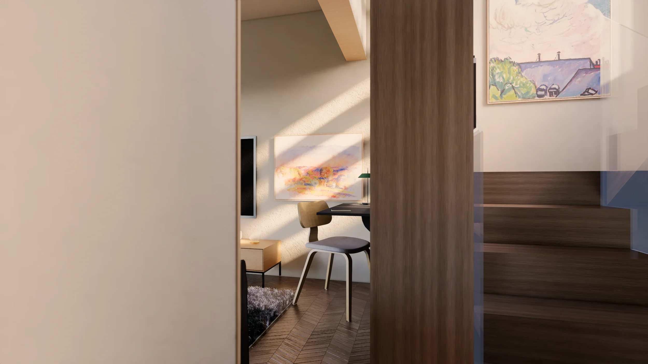 Strefa dzienna to centrum komfortu i wieczornego relaksu. Miękka sofa z włoskiej skóry łączy się z obłymi kształtami fotela. Po prawej znajduje się niewielki pulpit do lekkiej pracy.
