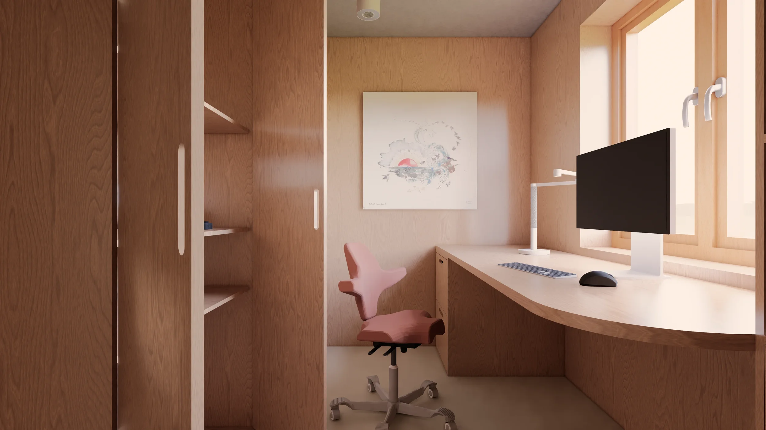 Minimalistyczna forma gabinetu pozwala skupić się na pracy. Dzięki ścianom wyłożonym drewnem w pomieszczeniu zachowana jest odpowiednia akustyka, pomocna podczas spotkań. Duża ilość przechowywania i prosty schemat komunikacji sprawiają, że pomimo niewielkiego metrażu gabinet jest prawdziwym centrum dowodzenia.